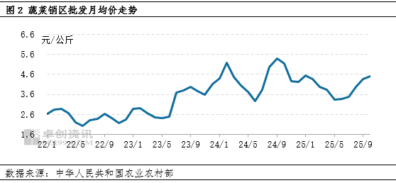 受产区价格上涨影响,销区批发端蔬菜价格上涨幅度也比较大。据农业农村部数据显示,2025年10月份蔬菜均价为4.51元/公斤,环比9月份上涨约3.68%。且10月份最后两周价格上涨幅度较大,11月份前两周价格继续呈现上涨态势,11月份前两周均价分别涨至5.26元/公斤和5.32元/公斤,较10月最后一周分别上涨5.62%和6.83%。