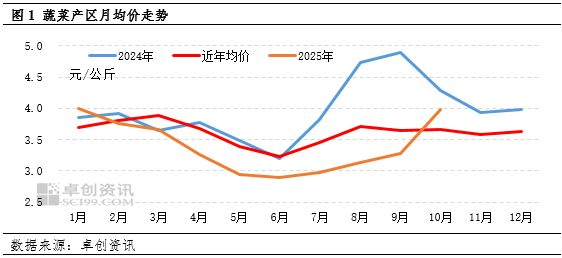 据卓创资讯(301299)监测,10月主要蔬菜产区蔬菜月均价3.98元/公斤,较9月上涨0.70元/公斤,涨幅21.32%,较去年10月份下跌7.25%,同比跌幅明显收窄。分品种来看,重点监测的13个品种中,10个品种价格环比出现上涨,2个品种环比下跌,1个品种价格环比持平。黄瓜、茄子、胡萝卜、西红柿价格涨幅居前;白菜、生姜价格跌幅居前。