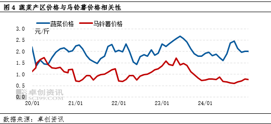 从马铃薯价格与蔬菜价格的相关性来看,两者相关系数达到0.55,表现为中度正相关,蔬菜价格越高,则马铃薯价格越高。但从价格变化的规律来看,马铃薯价格变化相对滞后于蔬菜价格。从品种来看,马铃薯作为重要的冬储菜,其价格与白菜、甘蓝、冬瓜、萝卜等冬储菜价格的价格关系较为密切。蔬菜价格上涨不一定完全带动马铃薯价格上行,也仍有利于马铃薯销量的整体增加。预计未来一个月,产区马铃薯价格将延续偏强走势,各产区价格预计涨幅在0.03-0.05元/斤。